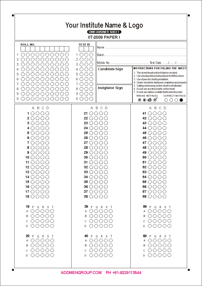IIT JEE OMR Sheet 2009 PatternIIT (Indian Institute of Technology) is one of the most prestigious institutes of the country. This is also the reason why getting an admission in the institute is no mean feat. You have to clear the entrance examination as well as personal interview round to secure a seat in this famous institute. The entrance exam for IIT uses OMR sheets, which contains bubbles as answer options. Addmen, which is the leading OMR manufacturer in India, has been designing the OMR sheets for IIT JEE since 2006. IIT JEE uses a complex exam pattern, and Addmen's OMR software has the capability to both design and read such bubble patterns. Here we present the IIT JEE OMR sheet 2009 pattern. Let us take a look at its features.