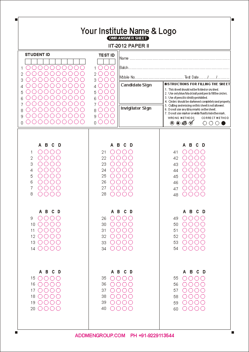 IIT JEE 2012 OMR Sheet for practiceStudents appearing for IIT JEE (Indian Institute of Technology Joint Entrance Examination) have to solve two question papers, Paper-I and paper-II. Both these papers are OMR based sheets, but the answer patterns for these papers are different. The IIT entrance exams use complex OMR bubble and score patterns as per their requirements. The three forms of patterns used in IIT entrance exams include MCQ based questions, integer based questions and matrix based questions. OMR answer sheet format for IIT 2012Both paper-I and paper-II of the OMR sheet of IIT 2012 begin with the space provided for information of the students. On the left are the blocks for writing and filling roll no. and test ID. On the right, you will find blocks for writing name, batch, mobile number and test date. Below, there are instructions to be followed for filling the OMR answer sheets. Next to it is the space provided for the signatures of the candidate and invigilator. The first paper contains of 60 questions in total, which are divided into three sections. Among these, 45 are MCQ based questions. These questions have four options, the answers of which can be one or two. The students have to mark the right answers as per the instructions provided in the question paper. The remaining 15 questions are integer type questions for numerical answers. Each question has 10 rows from 1-0. The second paper of the 2012 IIT examination also has 60 questions divided into three sections. However, the pattern is simple as there are only MCQ based questions that have four options each (ABCD). The IIT JEE free OMR question answer apps download for the year 2012 can be done here. You can use these papers for practice if you are planning to appear for the upcoming IIT JEE examinations. JEE OMR Sheet PDF file for direct printing of sample OMR Answer Sheet . 2 Coloured JEE OMR Sheet sample PDF for Inkjet Printer & Offset Printing |